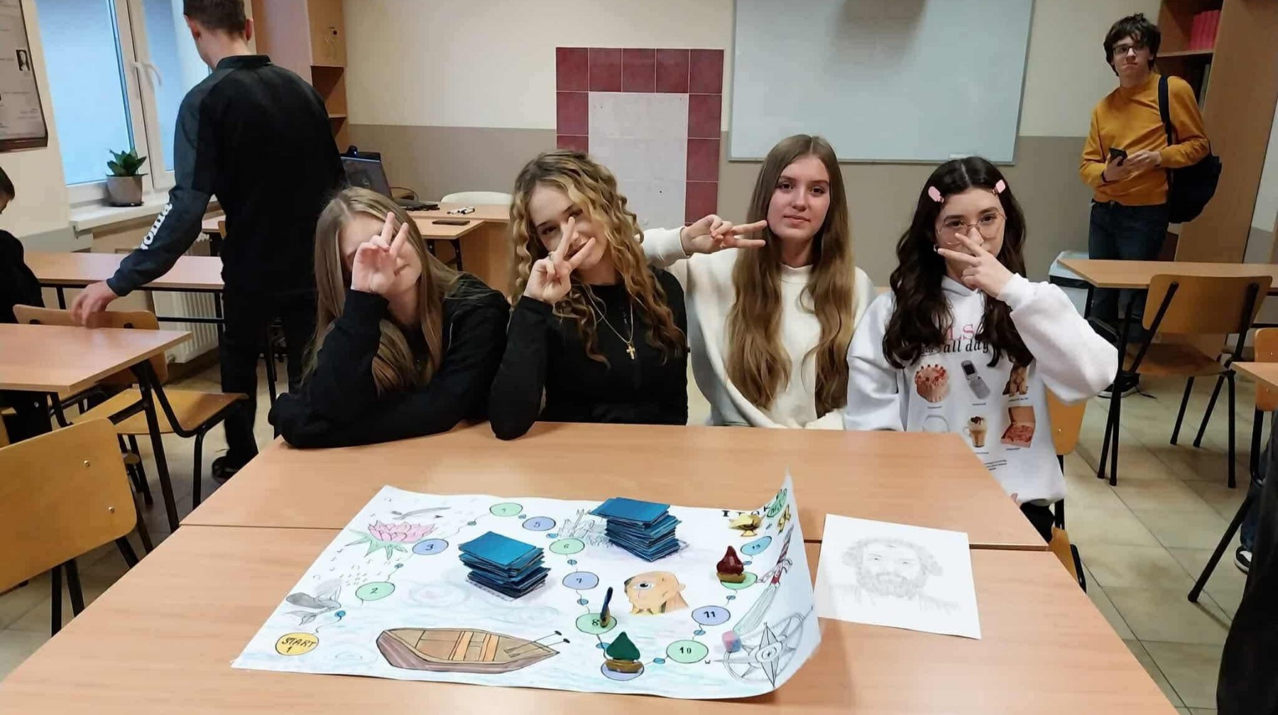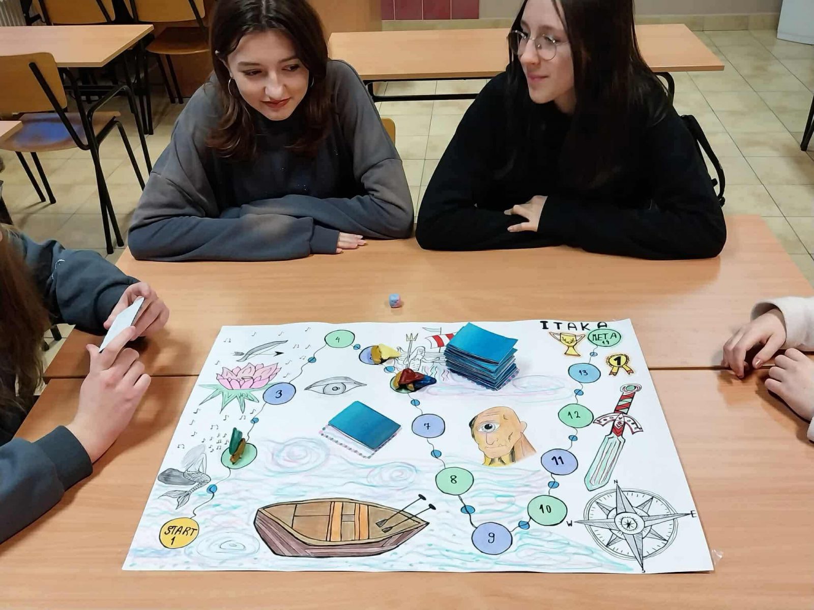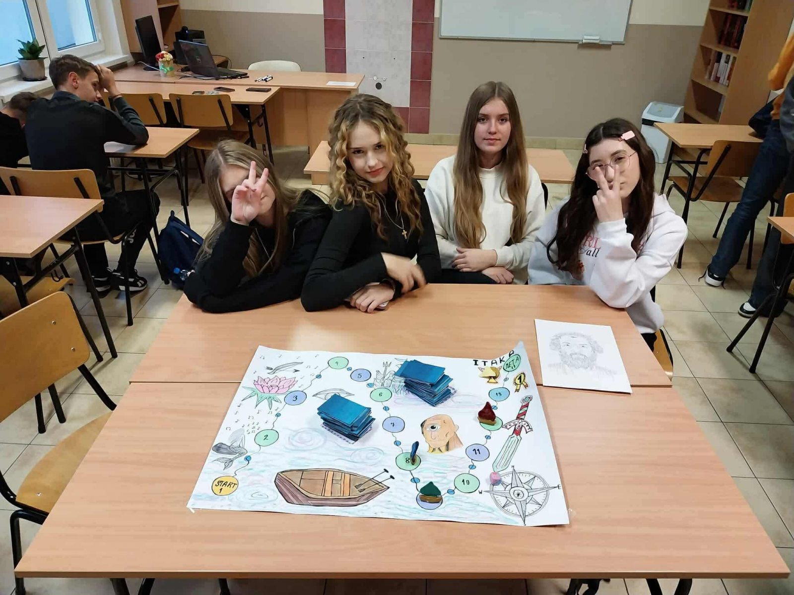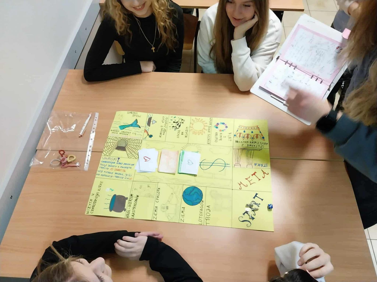 w oparciu o omawiany tekst. Pracowały w 4-osobowych zespołach według instrukcji. Zaplanowały swoją pracę, uwzględniając kolejne etapy wędrówki głównego bohatera. Wcześniej zapoznały się z treścią „Odysei” na podstawie której stworzyły grę. Przygotowały i napisały zasady gry, opracowały planszę do gry, a następnie przygotowały pytania i polecenia dla graczy. Wykonały planszę i inne elementy rozgrywki. Następnie przetestowały grę i sprawdziły zastosowane pomysły w praktyce, gdyż każda z grup grała w grę zaprojektowaną przez inny zespół. Efekty końcowe bardzo wszystkich zaskoczyły. Powstały ciekawe gry i kreatywne pomysły na to, jak można pracować z lekturą. Taka forma pracy miała na celu wymianę doświadczeń i pomysłów. Uczennice chętnie współpracowały ze sobą, były kreatywne i pomysłowe.