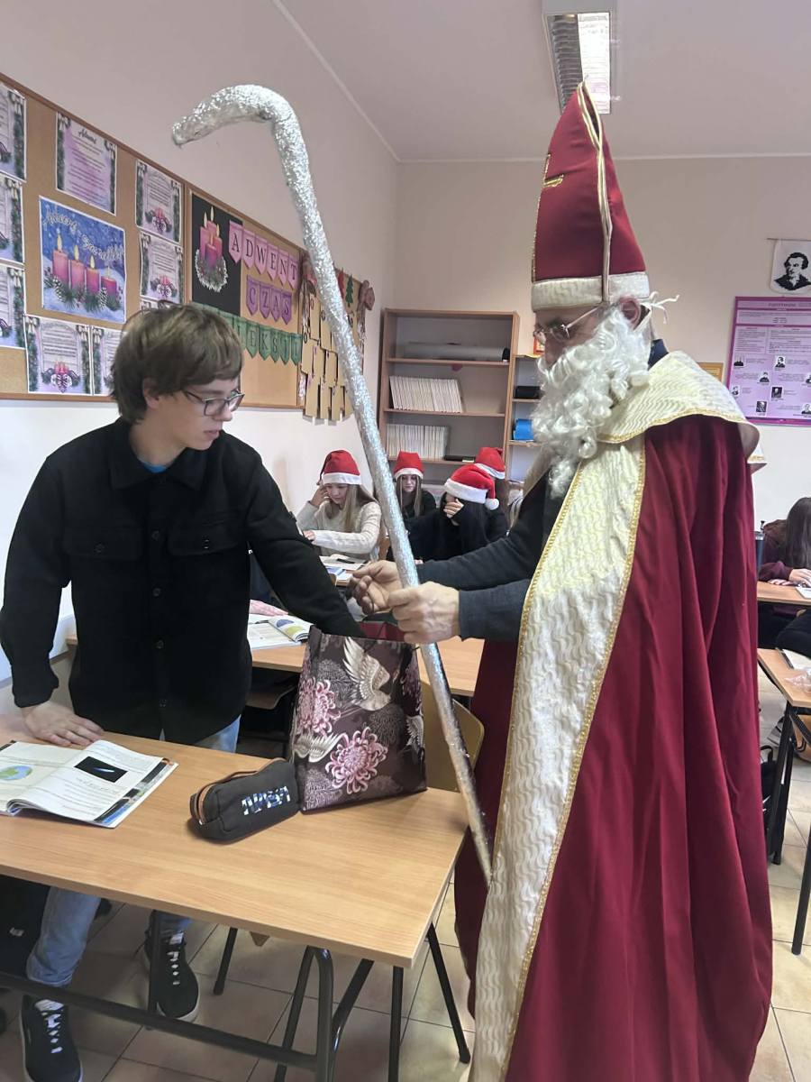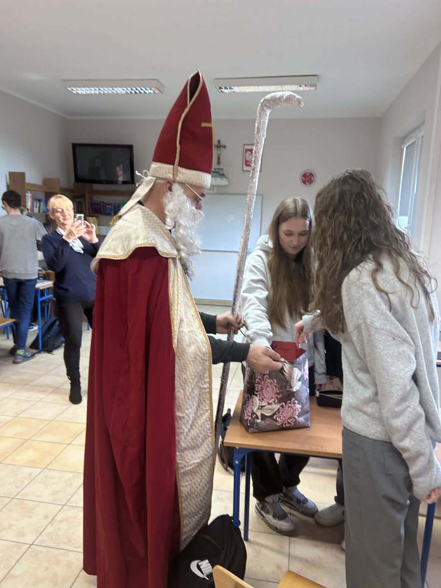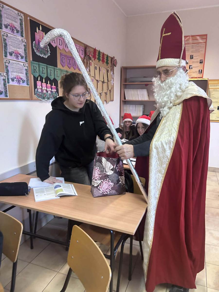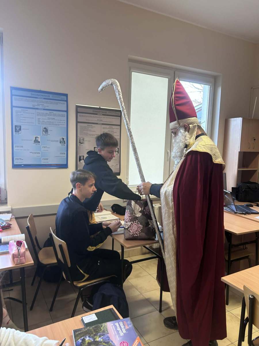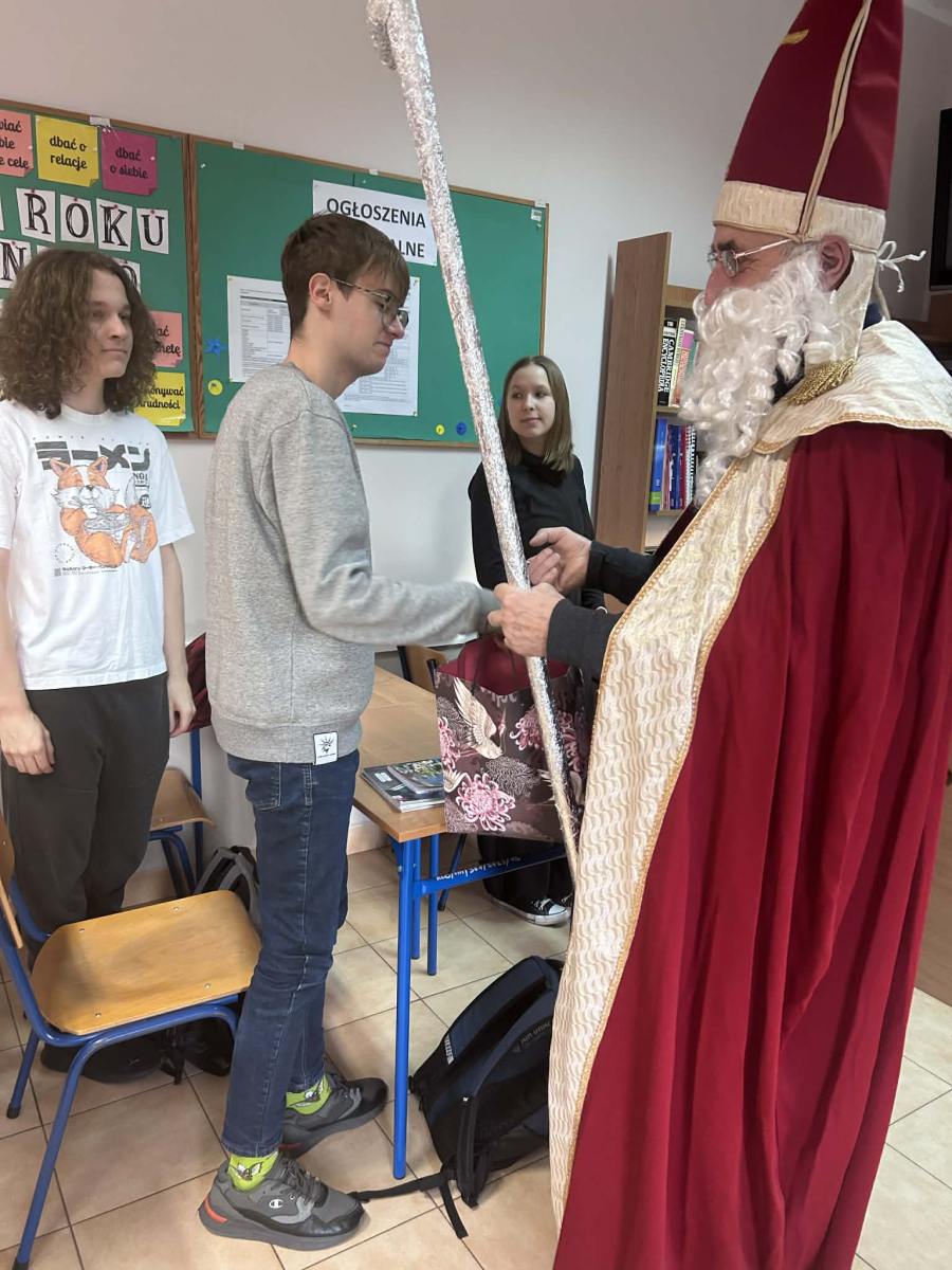 Dzisiejszy dzień był naprawdę wyjątkowy! Do naszej szkoły zawitał sam Święty Mikołaj, który z wielkim uśmiechem i jeszcze większym workiem słodyczy przeszedł przez wszystkie klasy. Każdy uczeń otrzymał od niego słodki upominek – bo przecież Mikołaj zawsze pamięta o tych, którzy cały rok byli grzeczni (lub prawie).