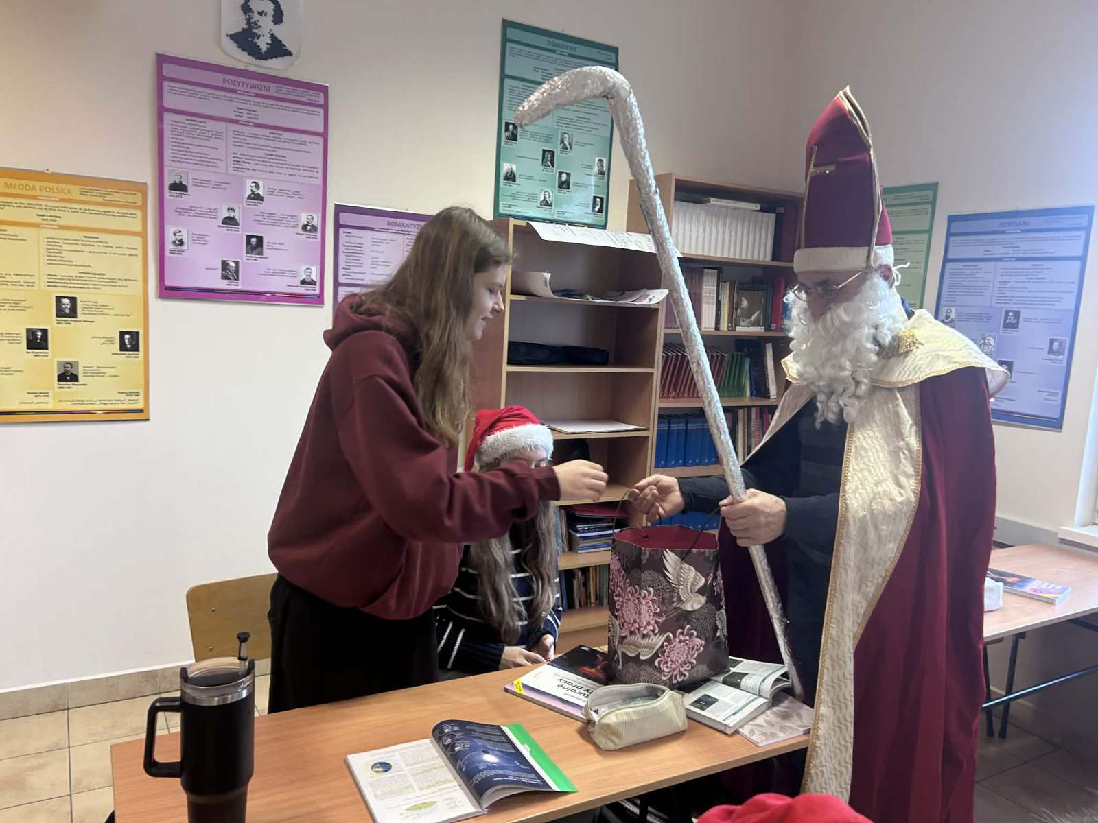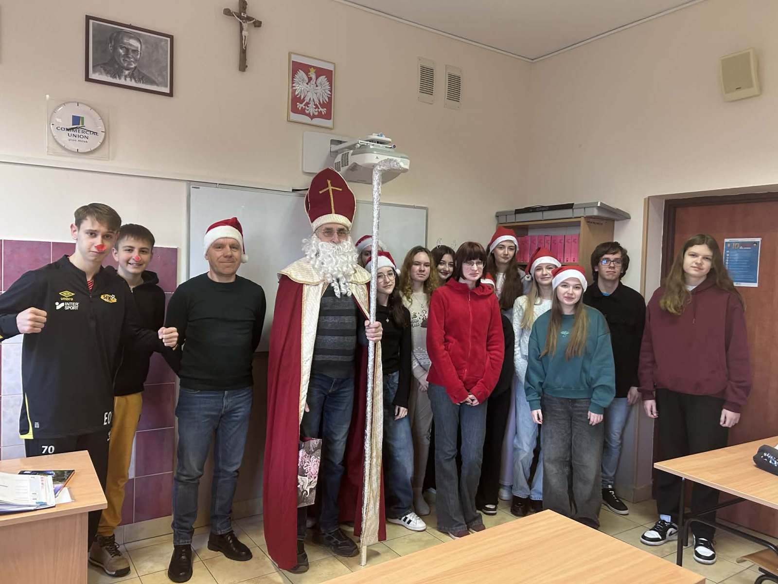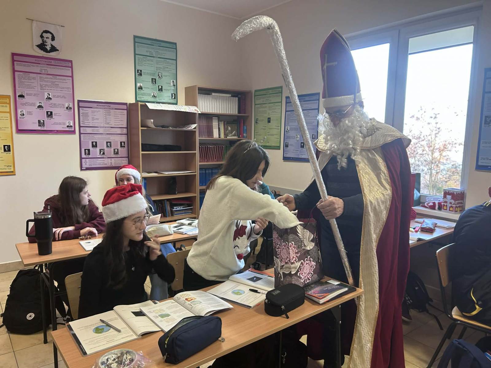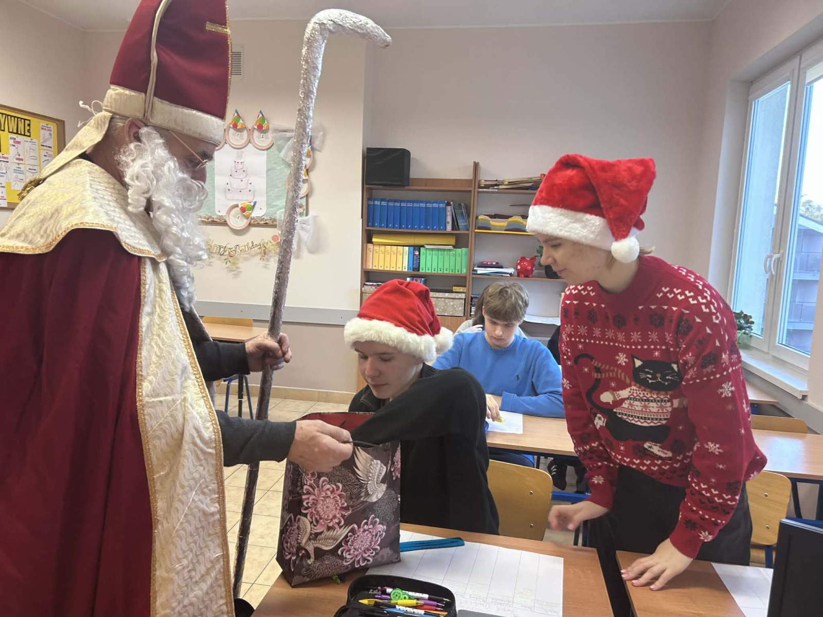 Uczniowie, którzy włączyli się do zabawy i założyli mikołajkowe czapki, mogli liczyć na mały świąteczny bonus… czyli zwolnienie z odpowiedzi.